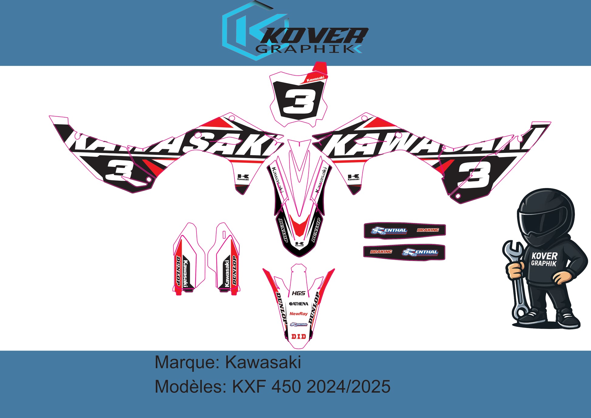 Inspiré du style officiel Kawasaki, ce design marie le noir intense, le rouge vif et le blanc pur pour un rendu à la fois pro et percutant.