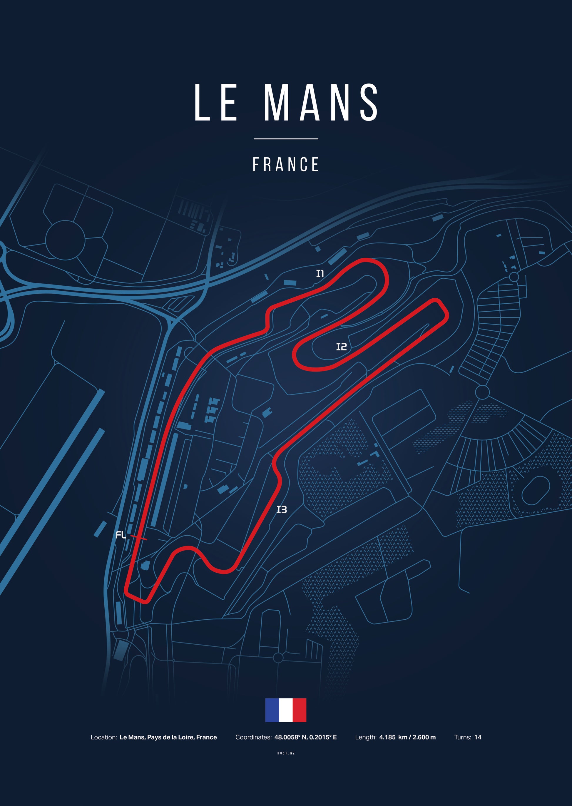 Ce design unique signé Kover Graphik met en avant le célèbre circuit sarthois, berceau du MotoGP et des 24 Heures du Mans, avec un style graphique moderne et épuré.