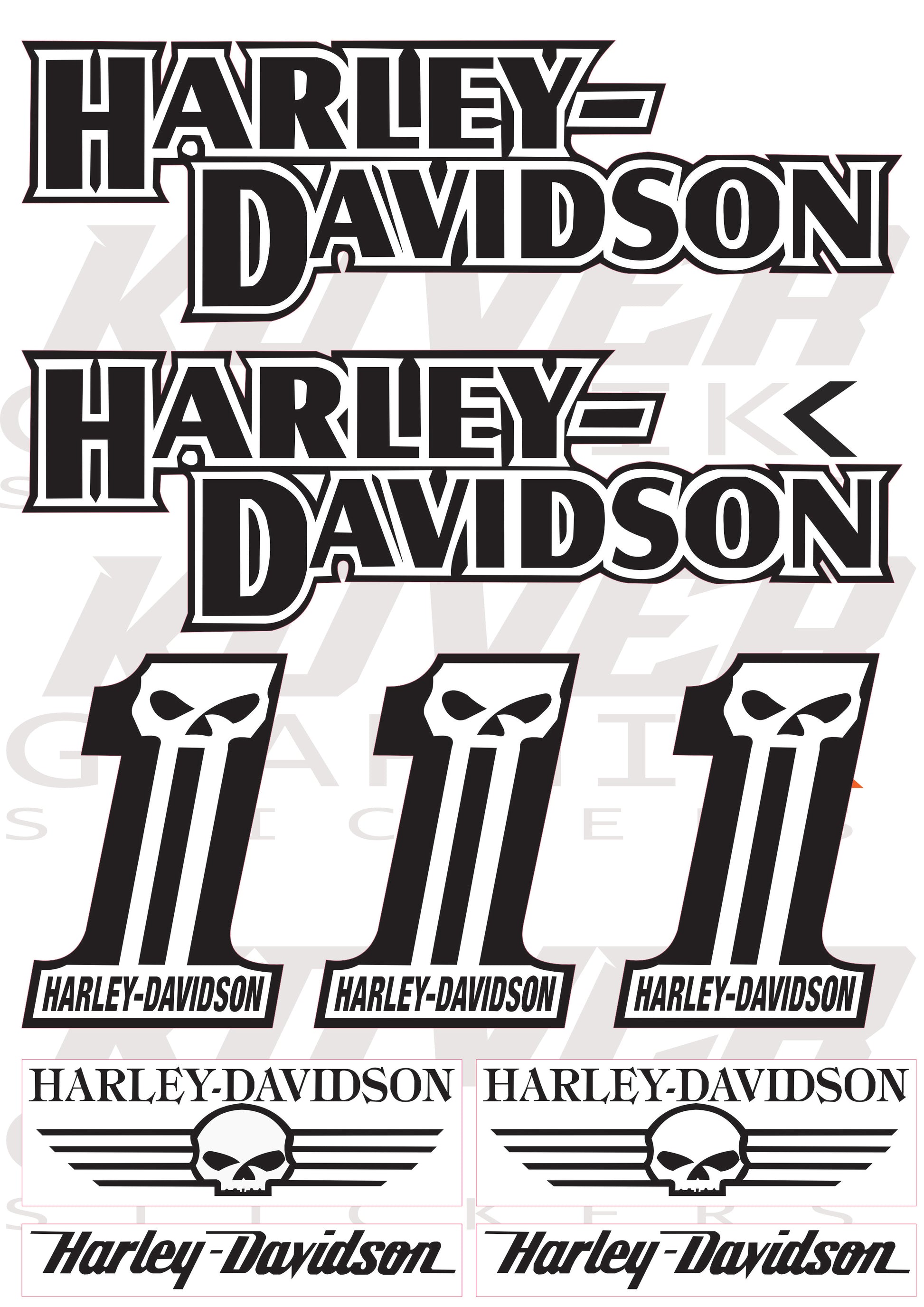 Ce lot comprend plusieurs logos Harley-Davidson emblématiques, dont le Skull Harley, les logos classiques et des déclinaisons colorées (orange, noir, rouge, vert, jaune, bleu, etc.).